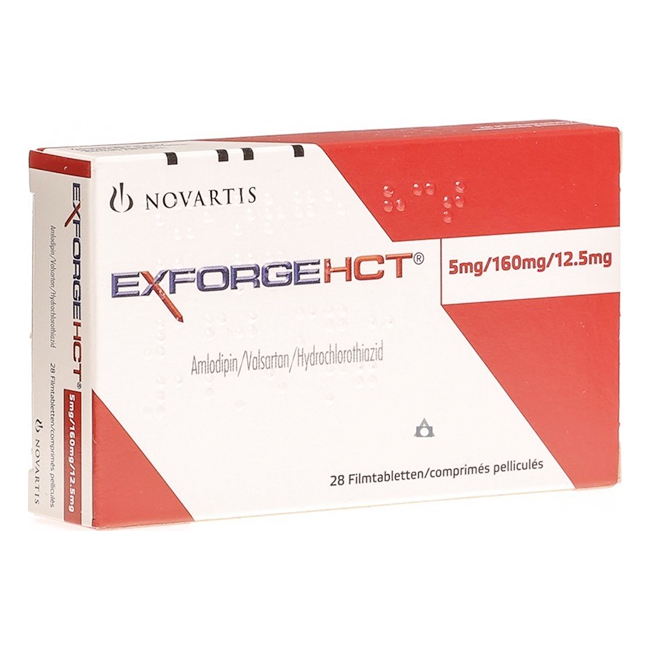 A(z) EXFORGE HCT 5 mg/160 mg/12,5 mg filmtabletta (28x) amlodipine;hydrochlorothiazid;valsartan hatóanyagú, vényköteles gyógyszer, gyártója a Novartis Europharm. Exforge HCT is a medicine that contains three active substances, amlodipine, valsartan and hydrochlorothiazide. This product contains 3 medications:.