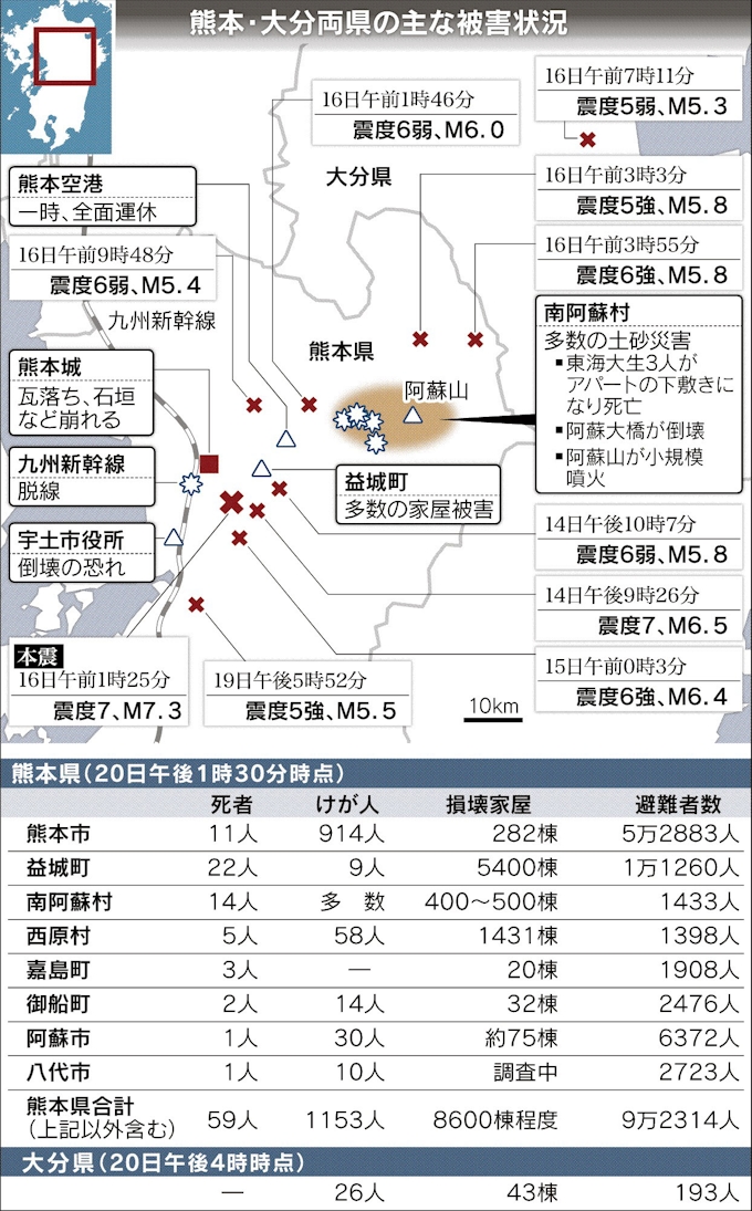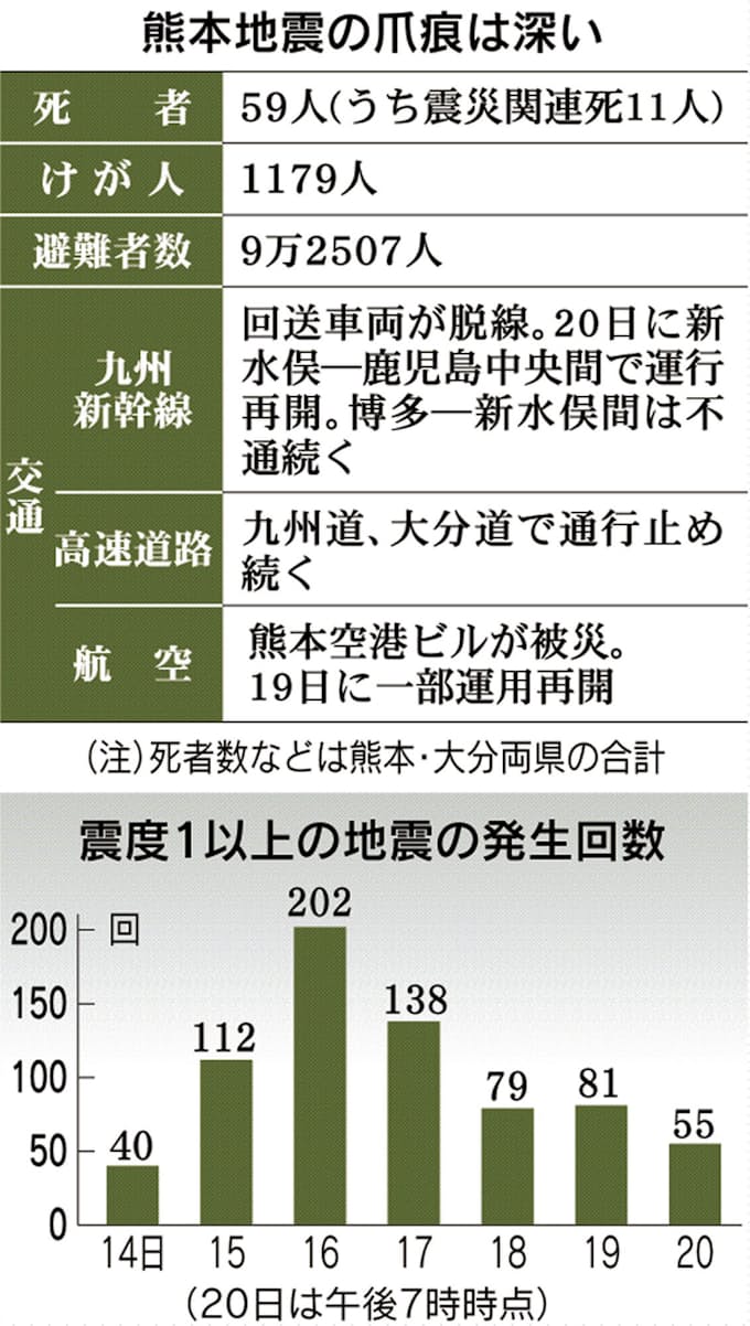 熊本地震1週間 9万人なお避難 死者59人 日本経済新聞